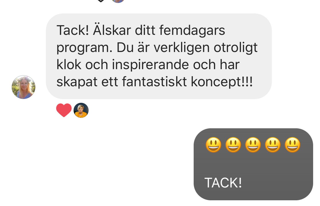 Under fem dagar kommer du få tillgång till fem föreläsningar och fem uppgifter som är designade för att träna ditt självledarskap. Allt sker online, först live och därefter i inspelat format. Du kommer lära dig massor som gör skillnad i ditt liv här och nu och som hjälper dig livet ut.